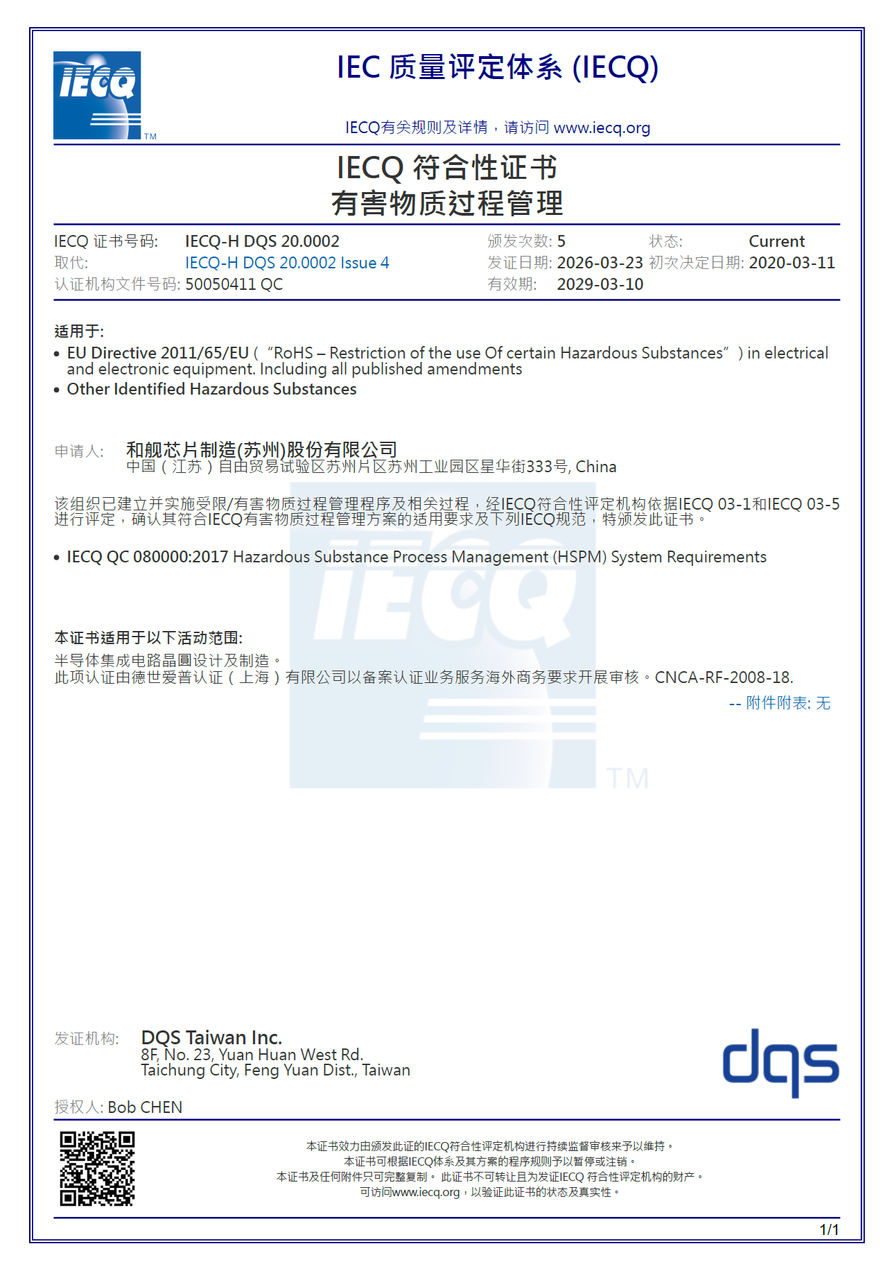 和舰芯片通过 IECQ QC 080000:2017 认证。